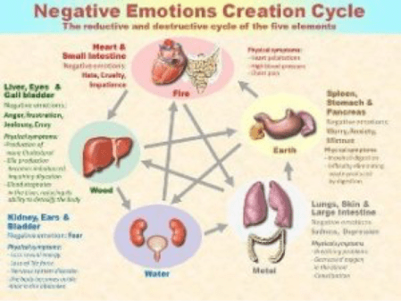 Desde un punto de vista teórico, es útil pensar en términos circulares sobre las Cinco Transformaciones de Energía o los 5 elementos: Fuego, Tierra, Metal, Agua, Madera. Cada elemento corresponde a su emoción y puede ser una emoción en un estado natural o en un estado bloqueado. (Figura 5)